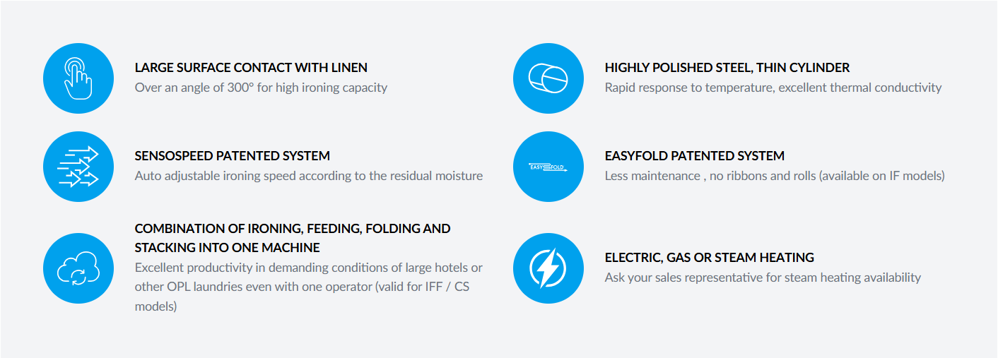 Konstruksi modern dari seri setrika Primus I menawarkan kinerja yang andal dan mampu memberikan layanan jangka panjang bagi bisnis laundry Anda, bahkan dalam kondisi kerja paling berat.